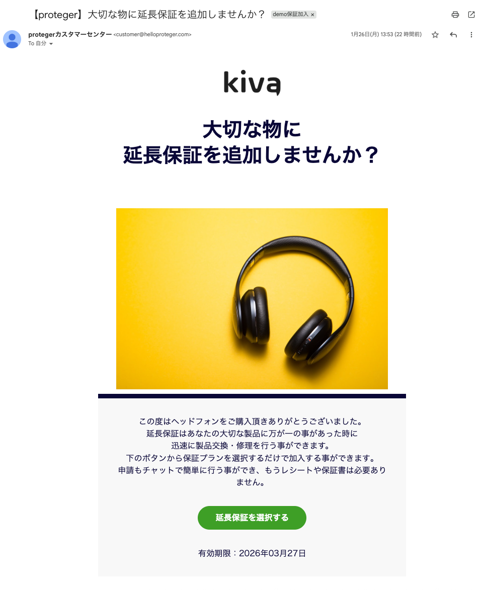 商品のみ購入したお客様にメールで延長保証をご案内し、リンクから後から延長保証を契約できます。