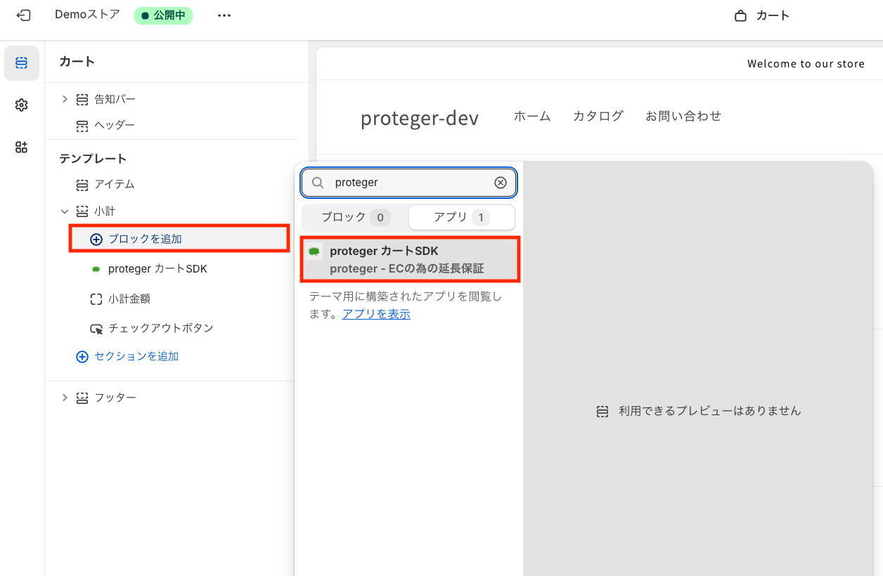 - モーダルが開くのでアプリタブからproteger カートSDKを探して追加します。